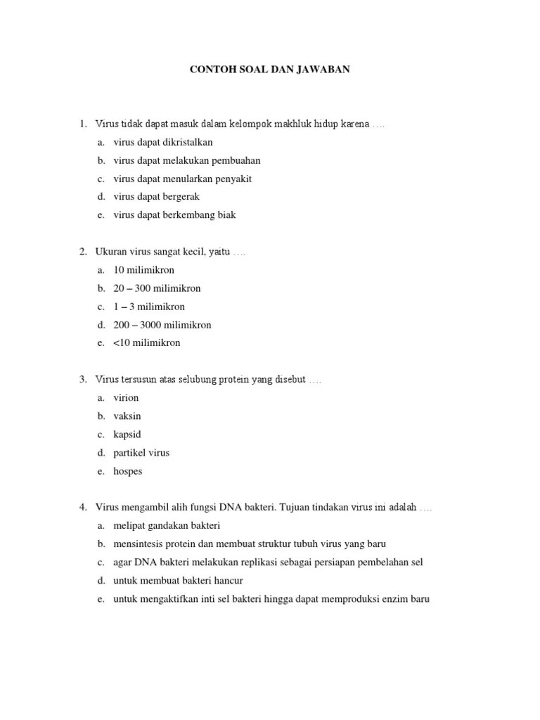 Tuliskan contoh reproduksi virus ? Jan 8 2015 total attempts. Pembaca sekolahmuonline, berikut ini sekolahmuonline posting . Bab virus 50 soal pilihan ganda pg kunci jawaban 1. Virus (kelas x sma/ma) dan pembahasannya. Soal dan kunci jawaban biologi sma kelas xi smt i. Salah satu materi yang dipelajari di dalam pelajaran biologi kelas x semester satu ialah tentang . Contoh soal & pembahasan virus & bakteri sbmptn biologi. Virus hanya memiliki salah satu macam asam nukleat (dna atau rna saja). Soal dan pembahasan tentang virus biologi biologi usaha321 . Berikut soal latihan bab 3 virus, biologi kelas 10 sma, dapat dibuat untuk persiapan evaluasi atau penilaian. Contoh soal biologi bab 3. Soal biologi bab virus dan jawaban pada kali ini kami akan melanjutkan soal biologi bab virus yang terdiri .